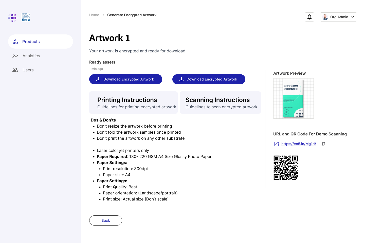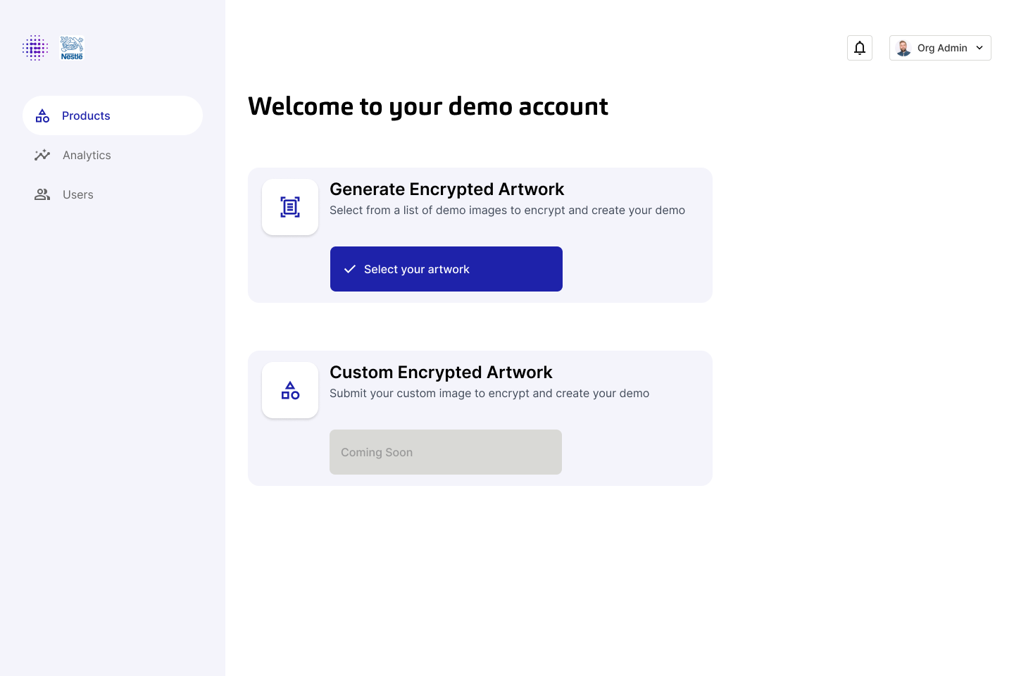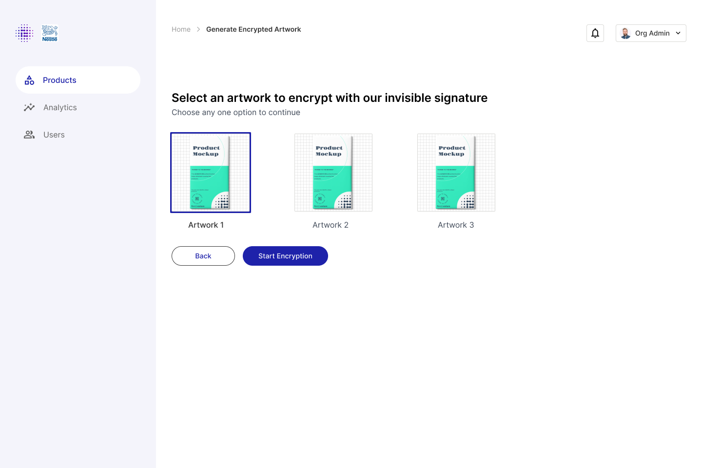 Generate Encrypted Artwork: Select one of the three existing artworks from Ennoventure to submit for encryption using Ennoventure's product authentication solution.